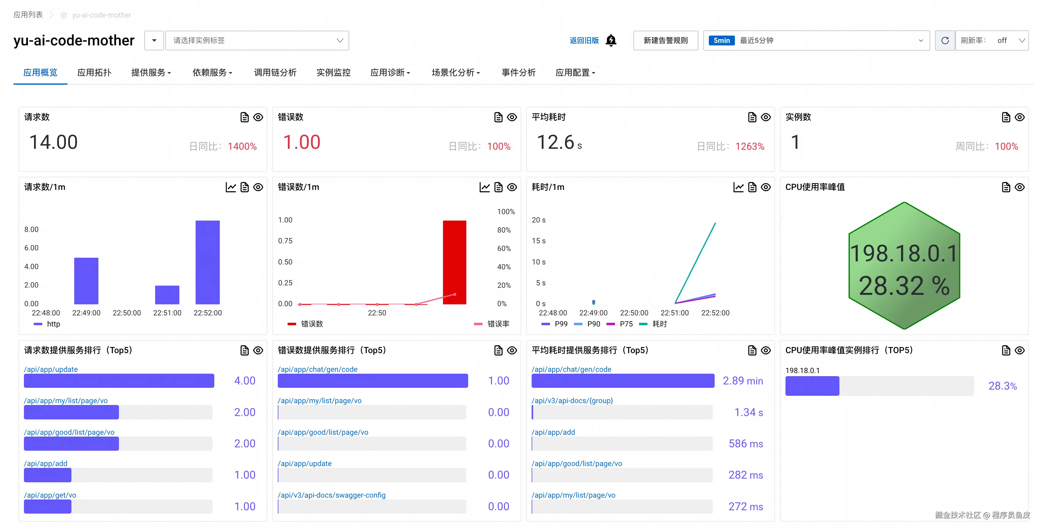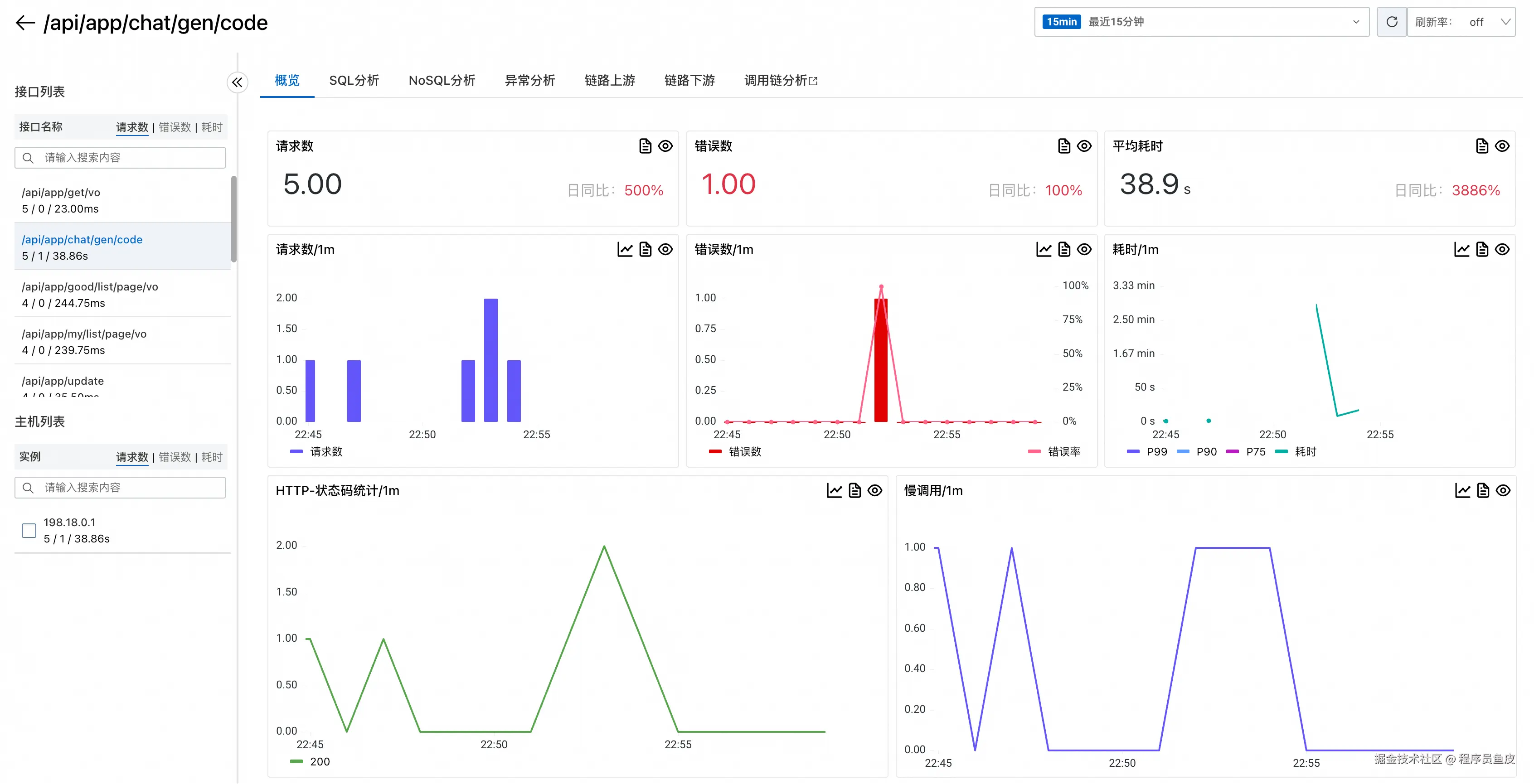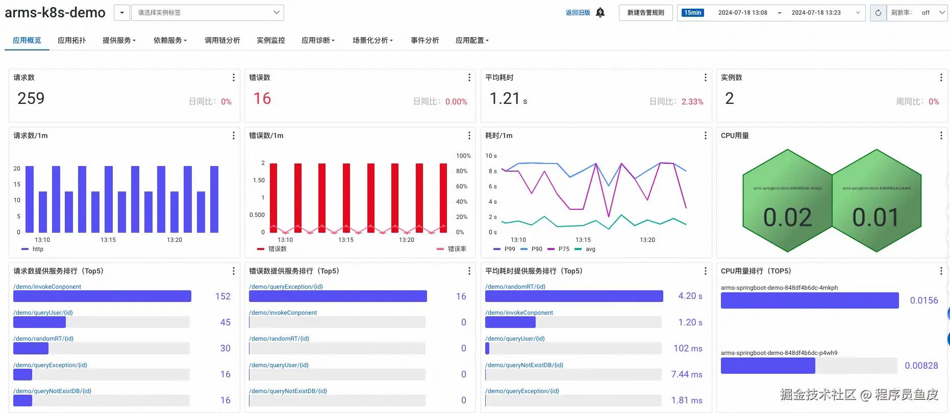 在这个页面可以看到应用的核心性能指标,包括请求数、响应时间、错误数等关键数据。