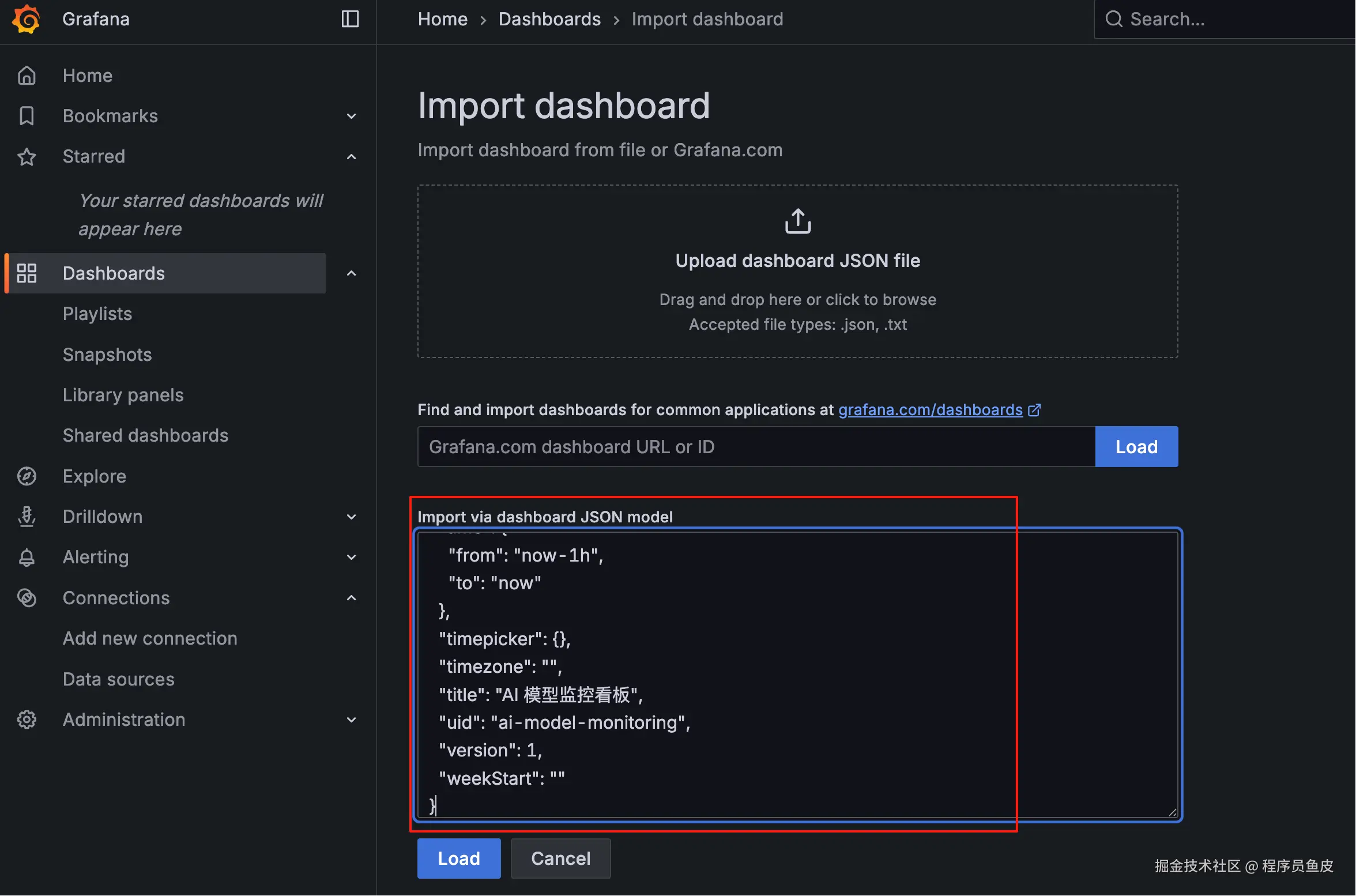 一个个手动创建图表会比较麻烦,更高效的方式是让 AI 帮我们生成完整的看板 JSON 配置。需要给 AI 提供需求说明、数据样例和 Grafana 规范。