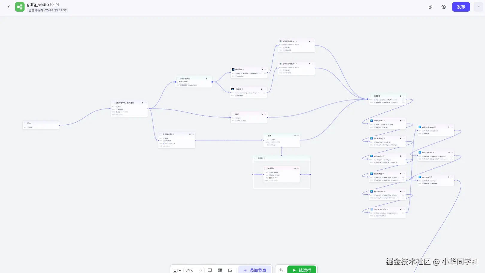 - 可视化 Workflow 编辑器:支持拖拽节点,设计对话与任务流。节点类型丰富,支持模型调用、变量逻辑、条件分支、循环等;