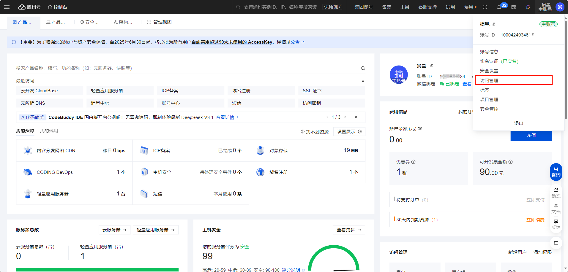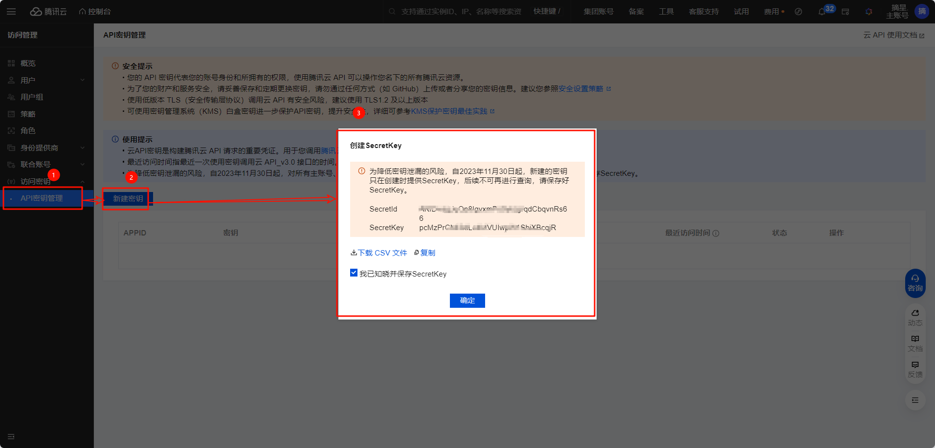 1. 登录 [腾讯云控制台](https://console.cloud.tencent.com/),点击右上角用户头像 → 选择"访问管理" 2. 在左侧菜单选择"访问密钥" → "API密钥管理",点击"新建密钥"按钮 3. 通过安全验证后,会展示您创建的密钥,请妥善保存好您的密钥 SecretId 和 SecretKey,自2023年11月30日起,新建的密钥只在创建时提供SecretKey,后续不可再进行查询⚠️ 重要提醒:SecretKey只能在创建时查看,后续无法再次查看,请务必妥善保存!