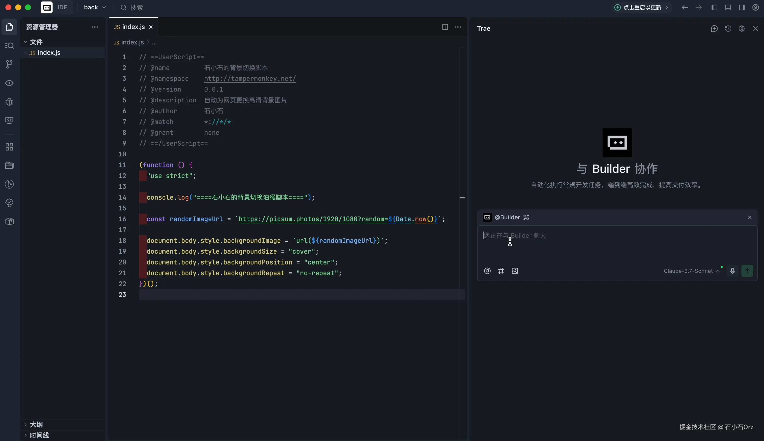 借助Trae的智能体,将油猴脚本迁移成谷歌插件非常便捷容易。创建一个脚本迁移的自定义智能体步骤如下: