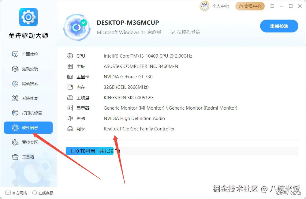 Step1、软件中的“硬件信息”可查看所有硬件型号,软件自动检测,不用自己动手去查