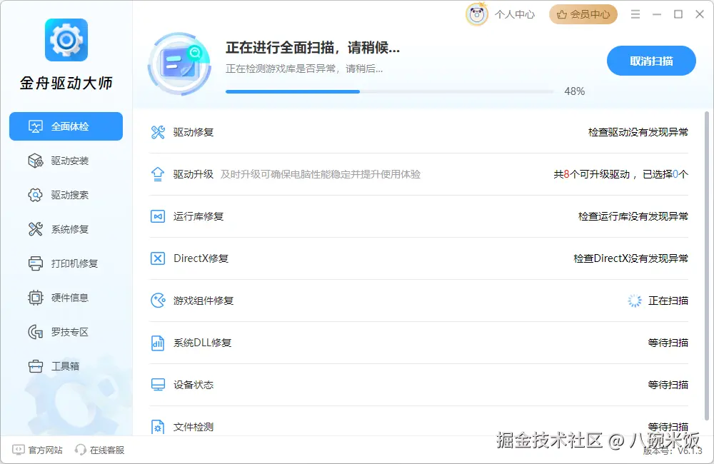 Step2、软件分别会从以下几点进行扫描检测,检测出当前驱动状态,并提供解决方案