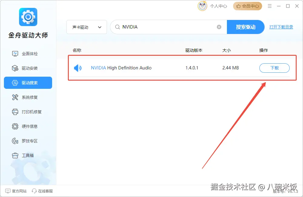 Step4、例如声卡驱动NVIDIA,在搜索结果页中点击“下载”,软件会自动下载该声卡驱动并进行安装。安装成功后,记得重启电脑哦