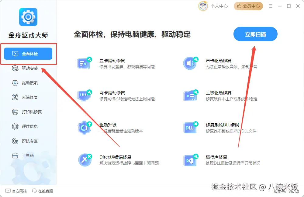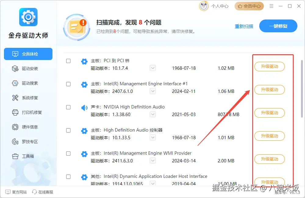 运行电脑时,不知道是不是因为驱动带来的报错,那么可以使用金舟驱动大师进行检测,并手动更新驱动或修复驱动,具体更新步骤如下: