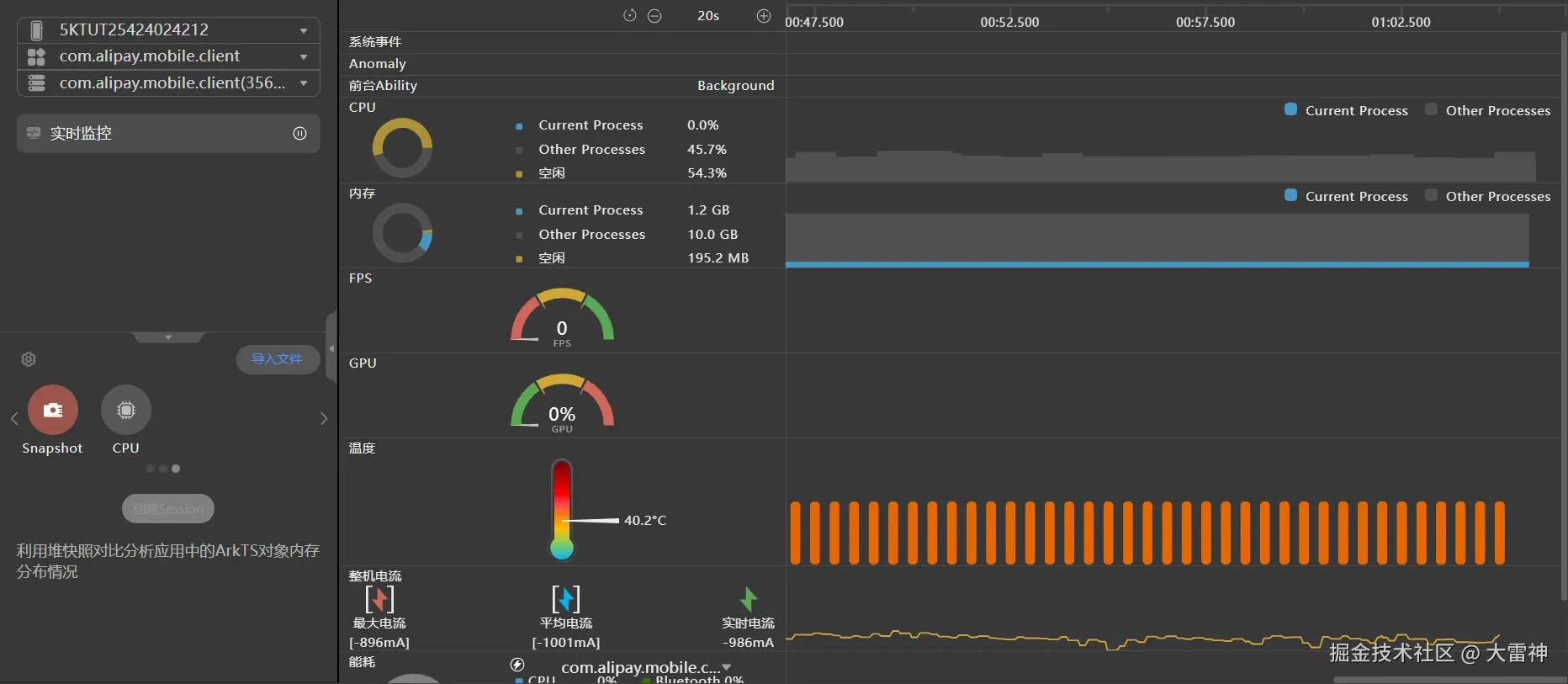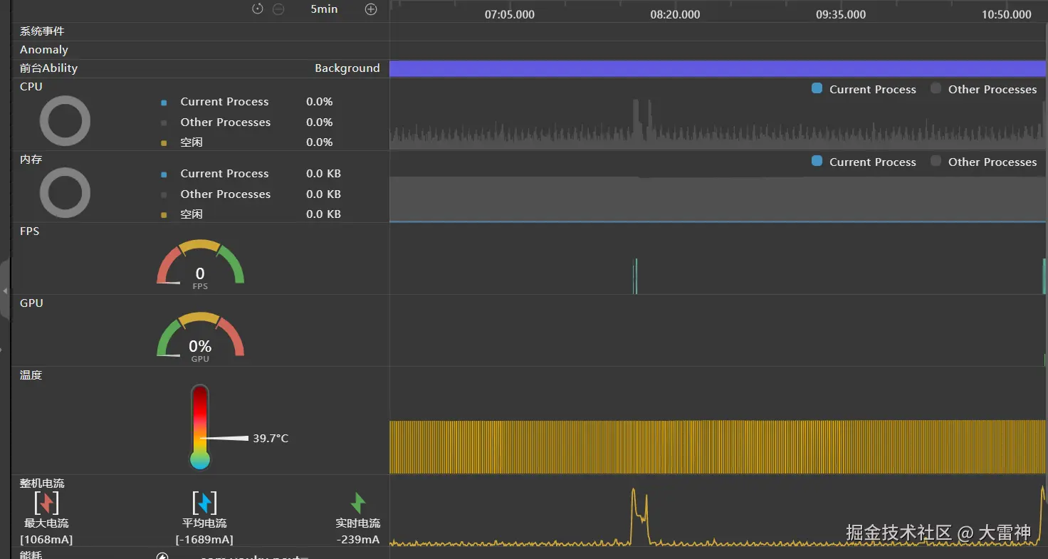 整个实时监控页面从上到下,依次展示了系统事件、异常事件、前台应用、CPU占用、内存占用、帧率、GPU使用率、温度、电流、能耗以及网络流量消耗等各个维度的数据,帮助您从多个维度来对比识别当前应用的性能热区。下面为您依次介绍每一条泳道的数据内容。