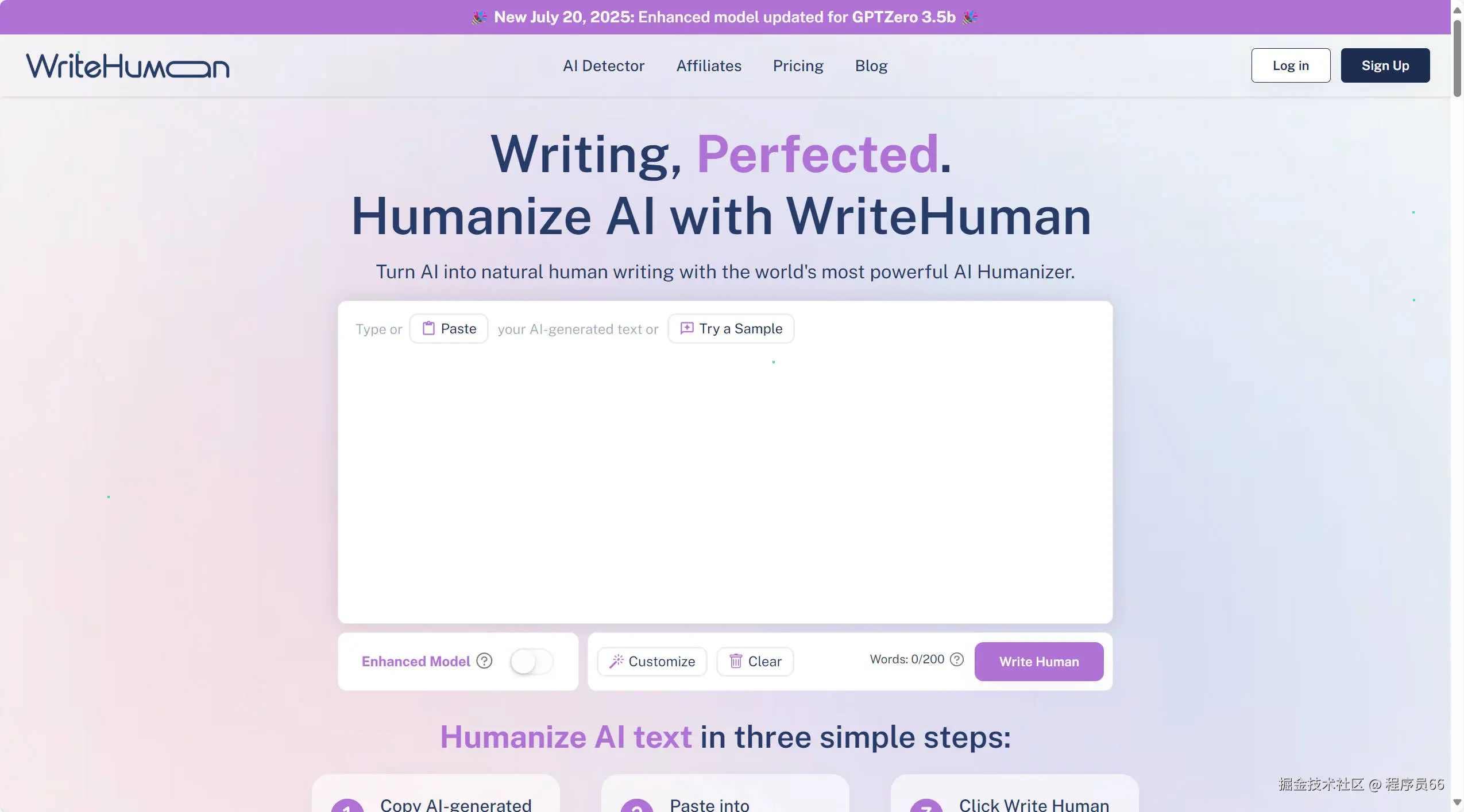 WriteHuman是一款专注于将AI生成文本转化为自然人类写作风格的工具。它靠着先进的自然语言处理技术,一门心思提升文本质量,让其难以被AI检测系统识别。特别是对于英文处理效果比较好,但是它只支持英文,不支持其他语言,这就有点局限了,要是能多支持几种语言,想必会更受欢迎。