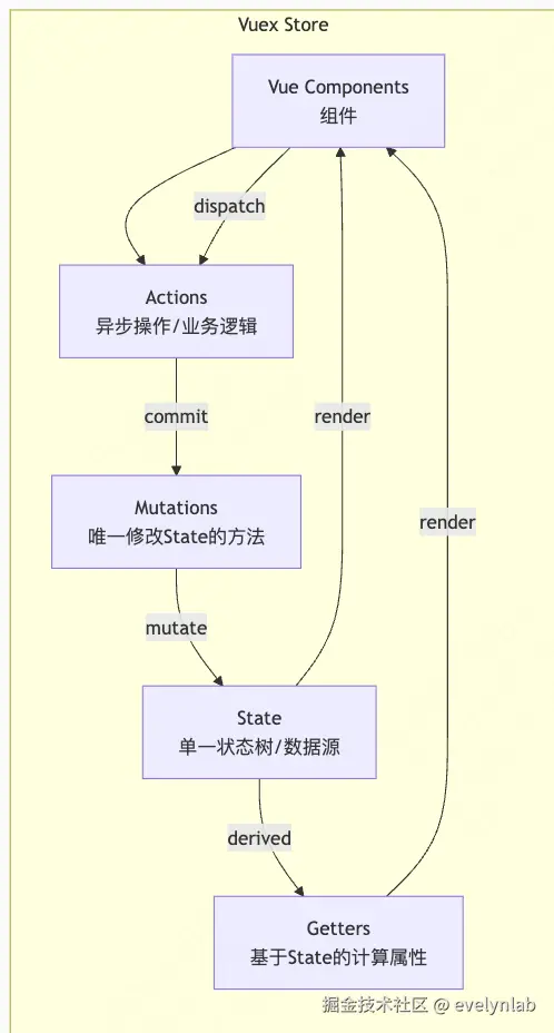 vuex: 组件 -> Dispatch Action -> Commit Mutation -> Modify State