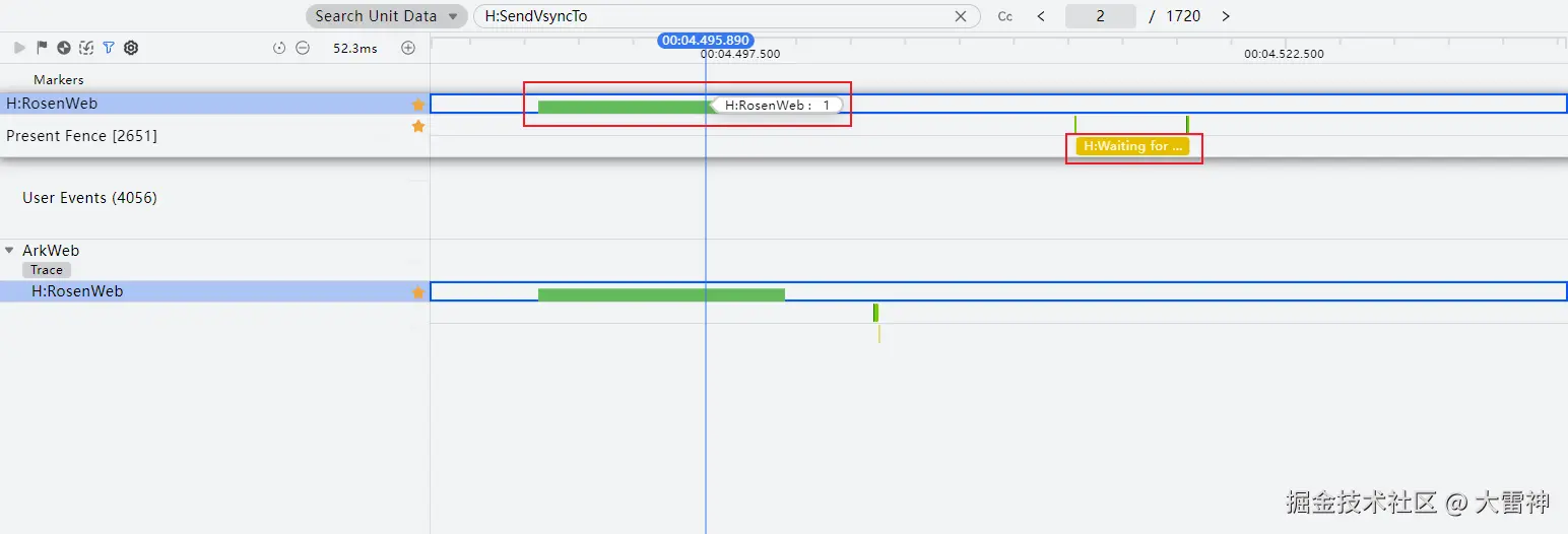 编辑一般结合RosenWeb泳道和Present Fence泳道来分析是否存在丢帧。RosenWeb上标识有待提交给渲染服务的数据量。正常情况下,每个数据量都会提交给硬件进行上屏,即Present Fence泳道上的H:Waiting for Present Fence trace点。如果某个数据量在Present Fence泳道上没有该trace点,那么很可能是存在丢帧问题