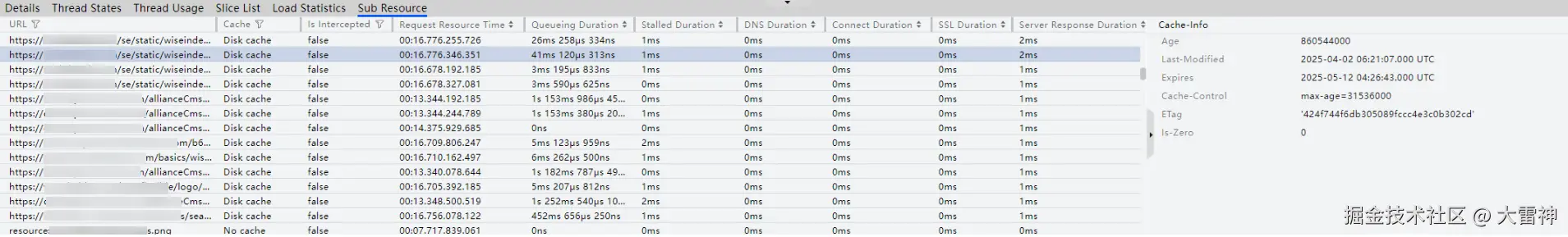 编辑点选某一行,可以查看该URL对应的缓存信息。包括缓存存在时长、最后修改时刻、过期时刻、缓存指令、资源的唯一标识符以及资源是否过期