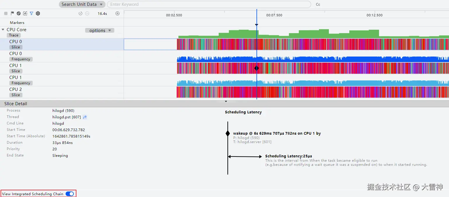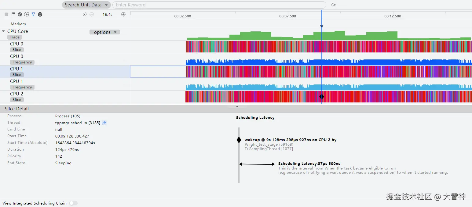 开启"View Integrated Scheduling Chain"后,点击CPU时间片泳道的节点可以查看某一个CPU运行线程的完整唤醒调度链。