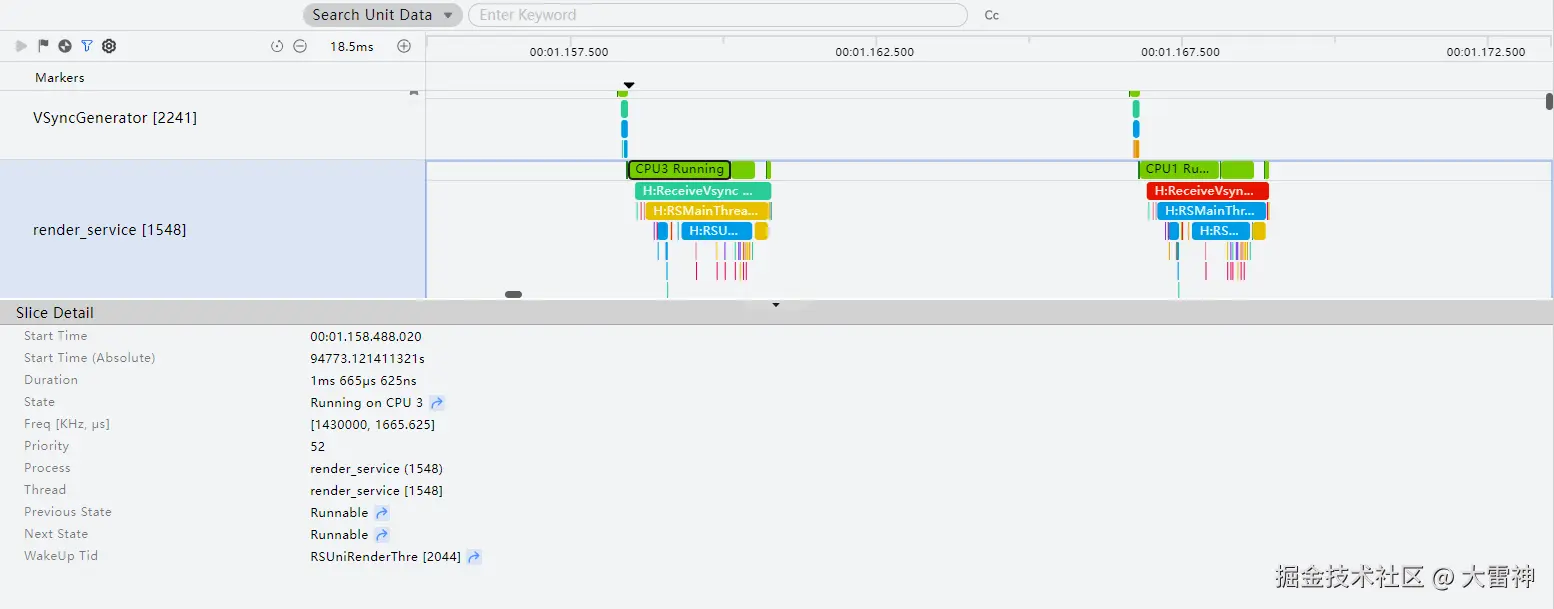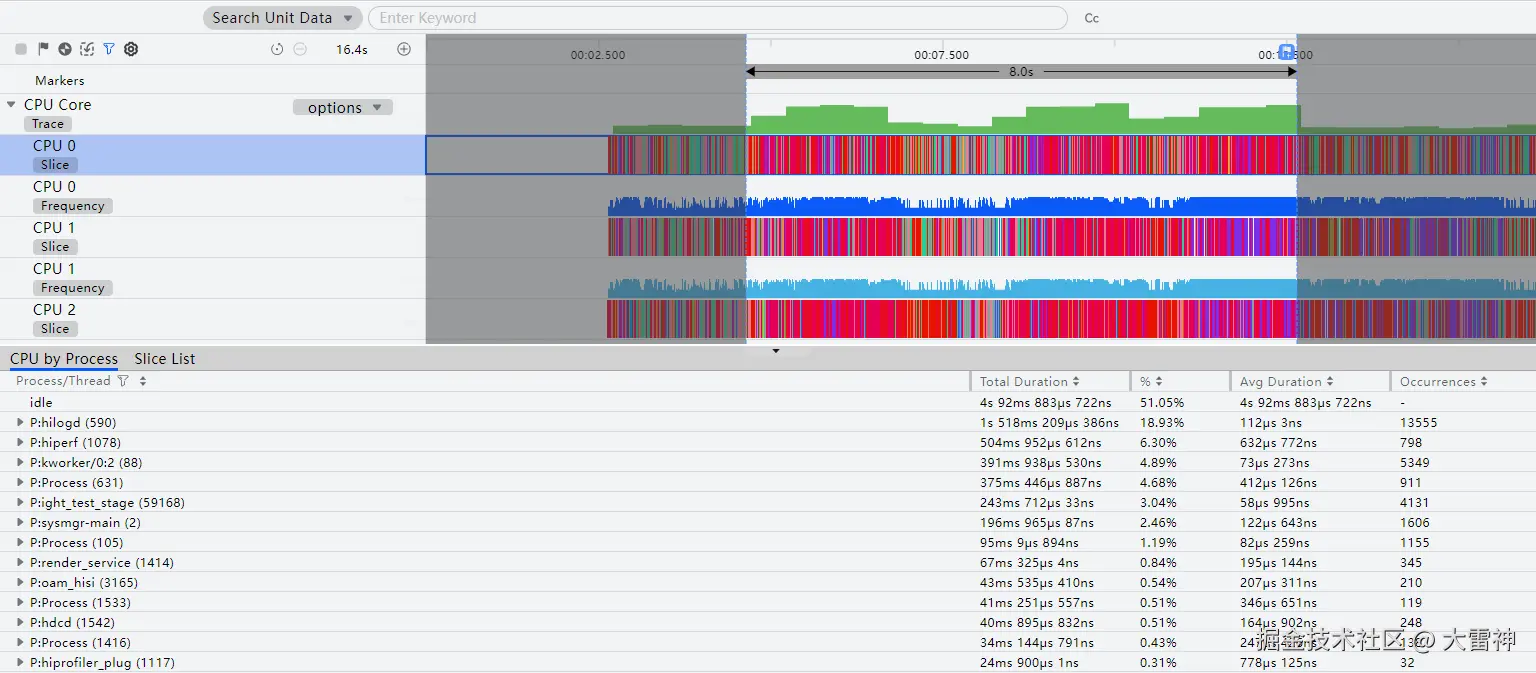 - Slice and Frequency:每个子泳道包含时间片和频率两部分,时间片显示占用该CPU核心的进程、线程。