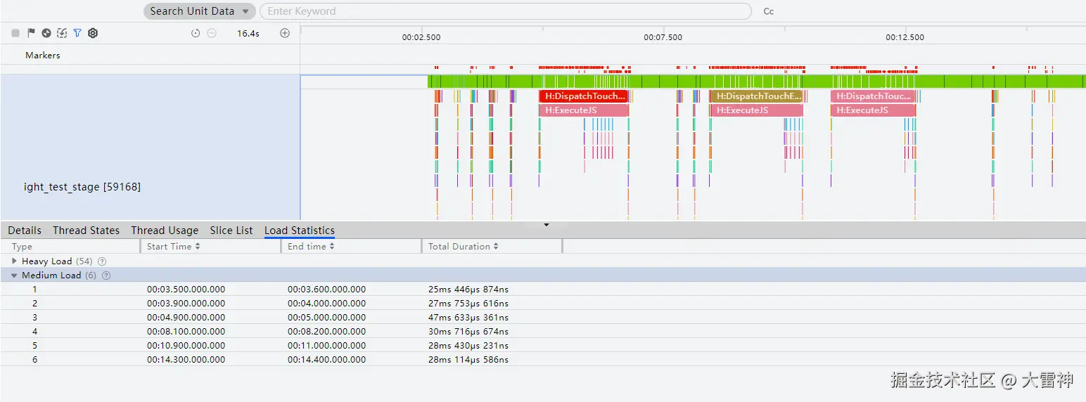 框选Thread泳道中多个运行状态的时间片,可查看此时间段内的不同运行状态的线程的统计信息,包括总耗时时长、最大耗时、最小耗时、平均耗时、处于当前状态的线程数量以及线程中的中载重载数据统计。