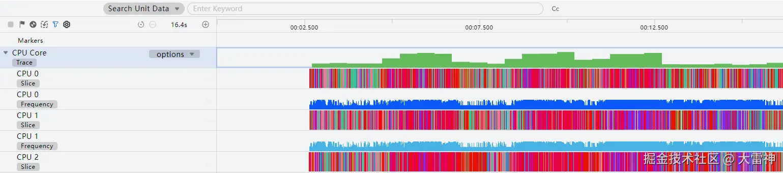 - Usage and Frequency:每个子泳道包含CPU核心使用率和频率两部分。