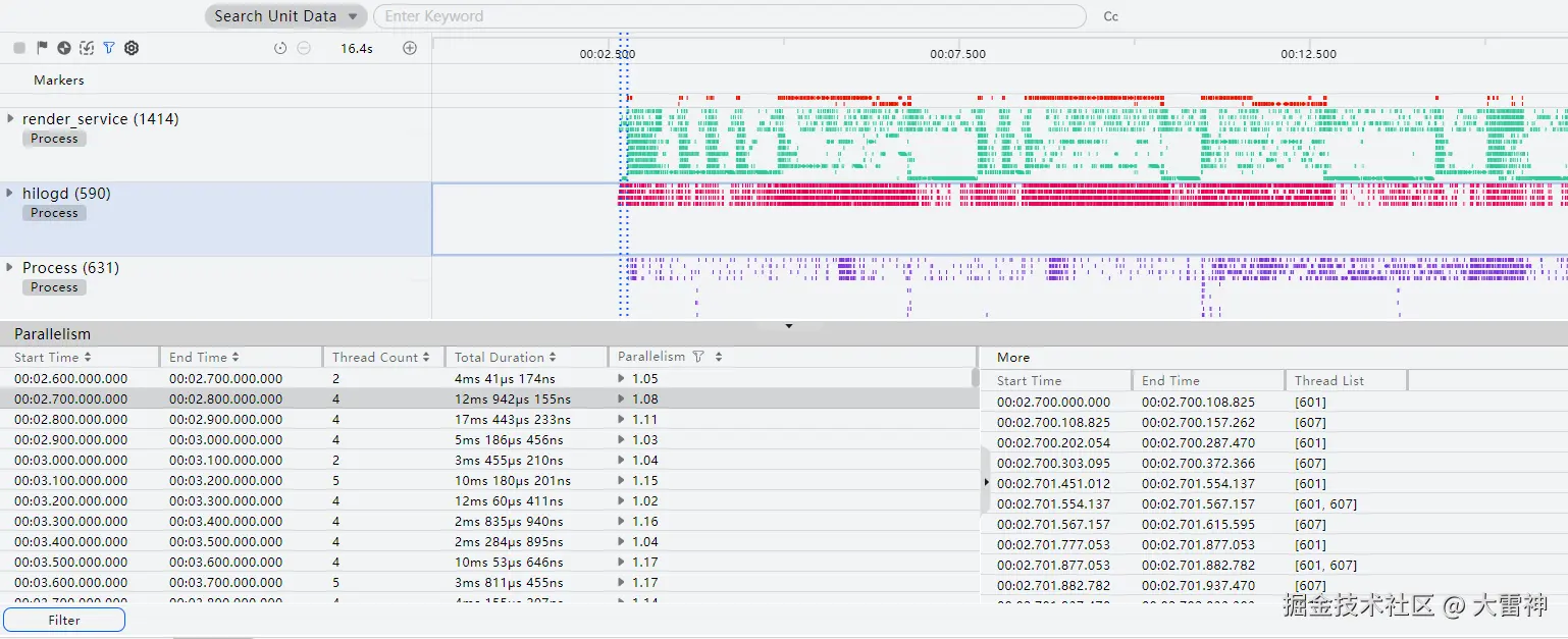 将鼠标悬浮在某时间片上时,能够置灰非同进程时间片,通过此方法可以确定时间片的关联性。