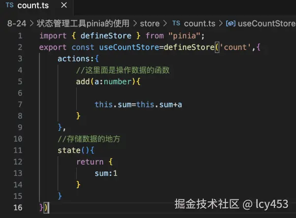 然后用defineStore初始化store容器。