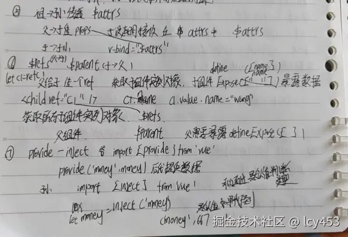 provide提供数据子组件inject拿。子获取父的时候需要父暴露数据,父获取子的实例对象也需要子暴露数据,不然数据是隐藏的。