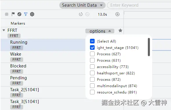 1:选择展开某个泳道,可以用options下拉框筛选不同进程。