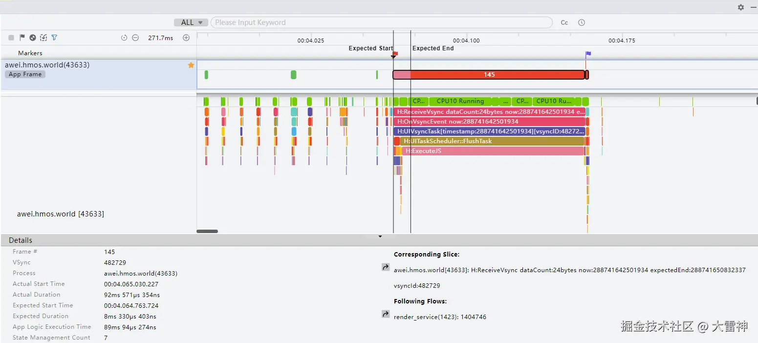 每帧的预期耗时(ms) = 1000ms / 帧率。如上图所示,选中超长帧后,可以看到该帧的预期耗时Expected Duration为 8ms 330μs,说明帧率是 120。实际耗时为 92ms 571μs,远超预期耗时,因此被识别为超长帧。超长帧的长时间渲染会直接影响用户体验,导致点击完成时延不达标。