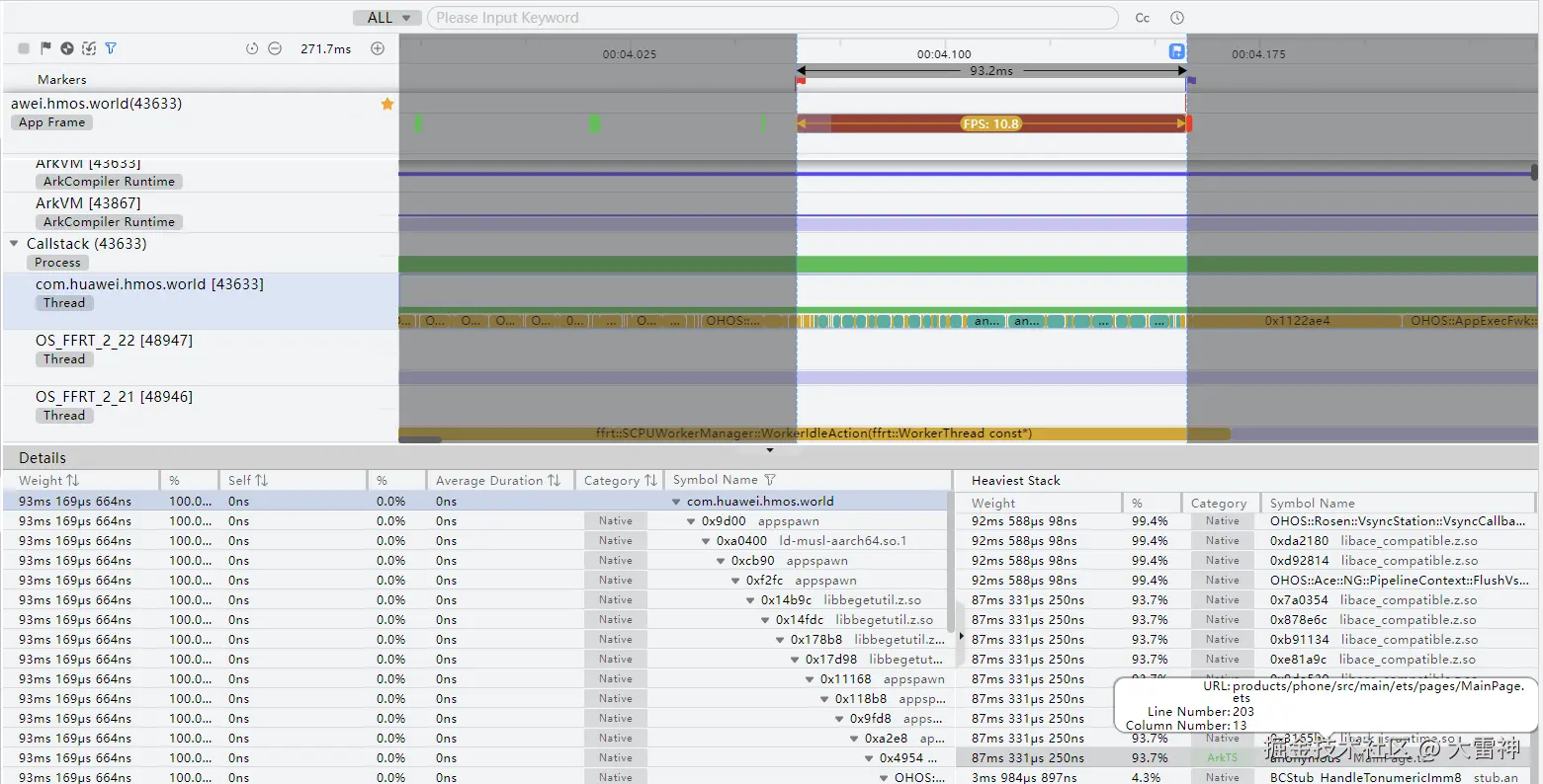 滑动查看右侧权重最高的函数调用栈,定位到MainPage.ets文件第203行代码为主要耗时原因。