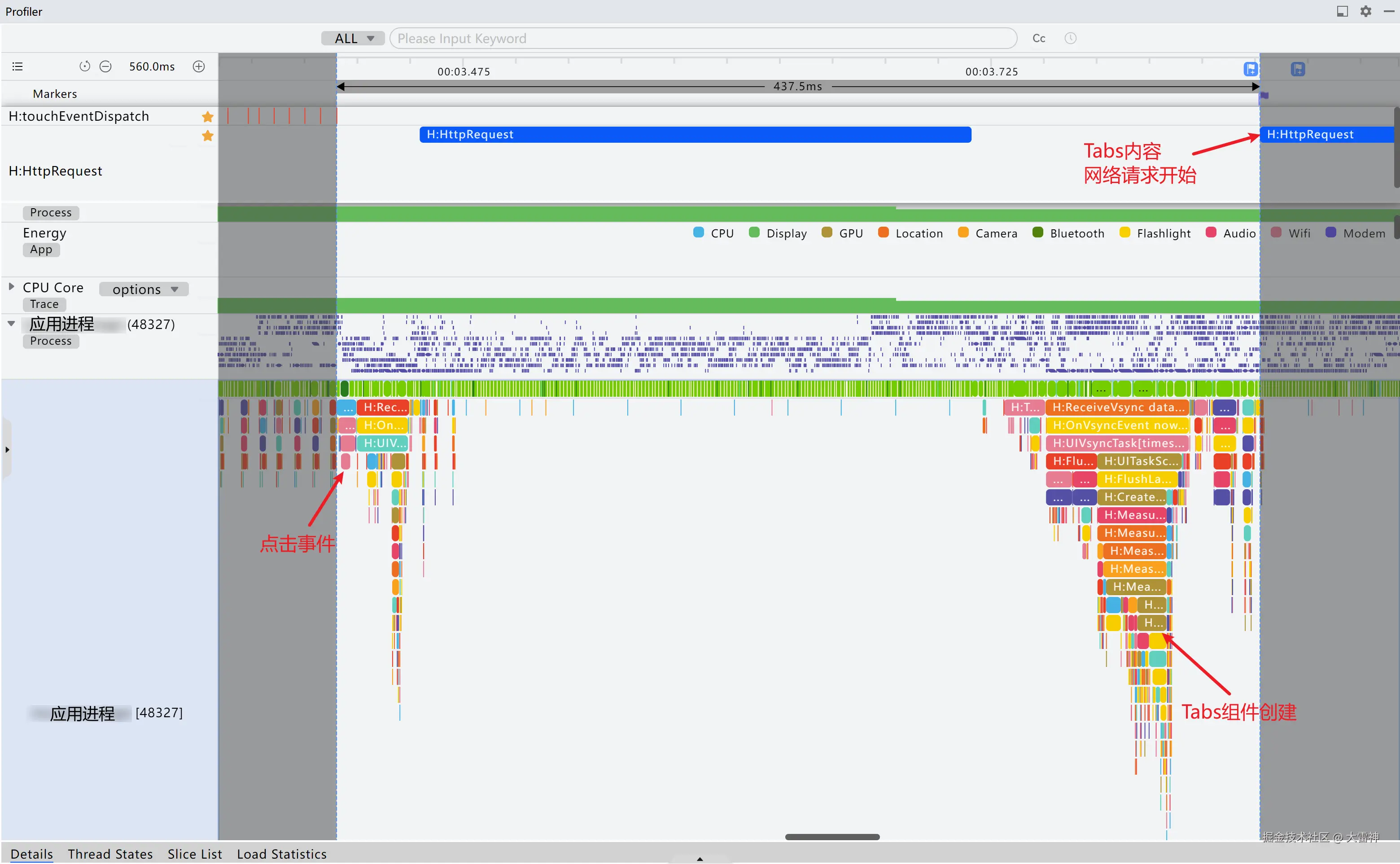 在页面切换过程中,如果存在加载的 loading 动画,出于用户体验考虑,可将动画停止与网络请求的完成相关联。例如,展示“加载中”状态,直到数据加载完成。通过 H:Animator 泳道,可以观察到动画的耗时。