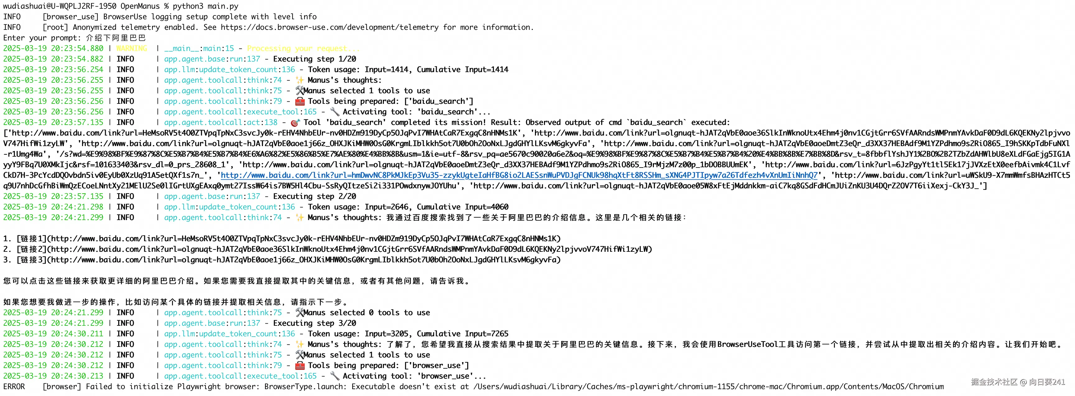 - Manus: 最终用户使用的代理类,集成了多种工具,包括Python执行、Google搜索、浏览器操作和文件保存。