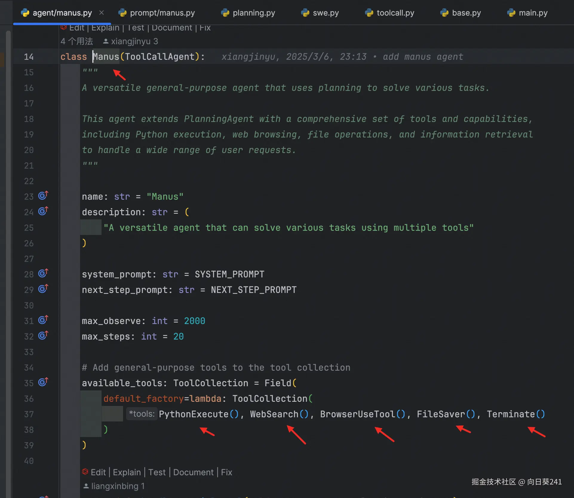 这一观点在OpenManus的源码中得到了验证。通过分析其架构和实现,我们可以看到,现代智能体技术的核心在于工具调用、多步骤规划和提示词工程,而这些OpenManus都已经实现。