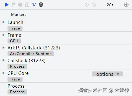 - Time:主要用于改进函数执行效率的分析,深度录制函数调用栈及每帧耗时等相关运行数据,并完整展现ArkTS到Native的跨语言调用栈,支撑Native API典型问题分析。