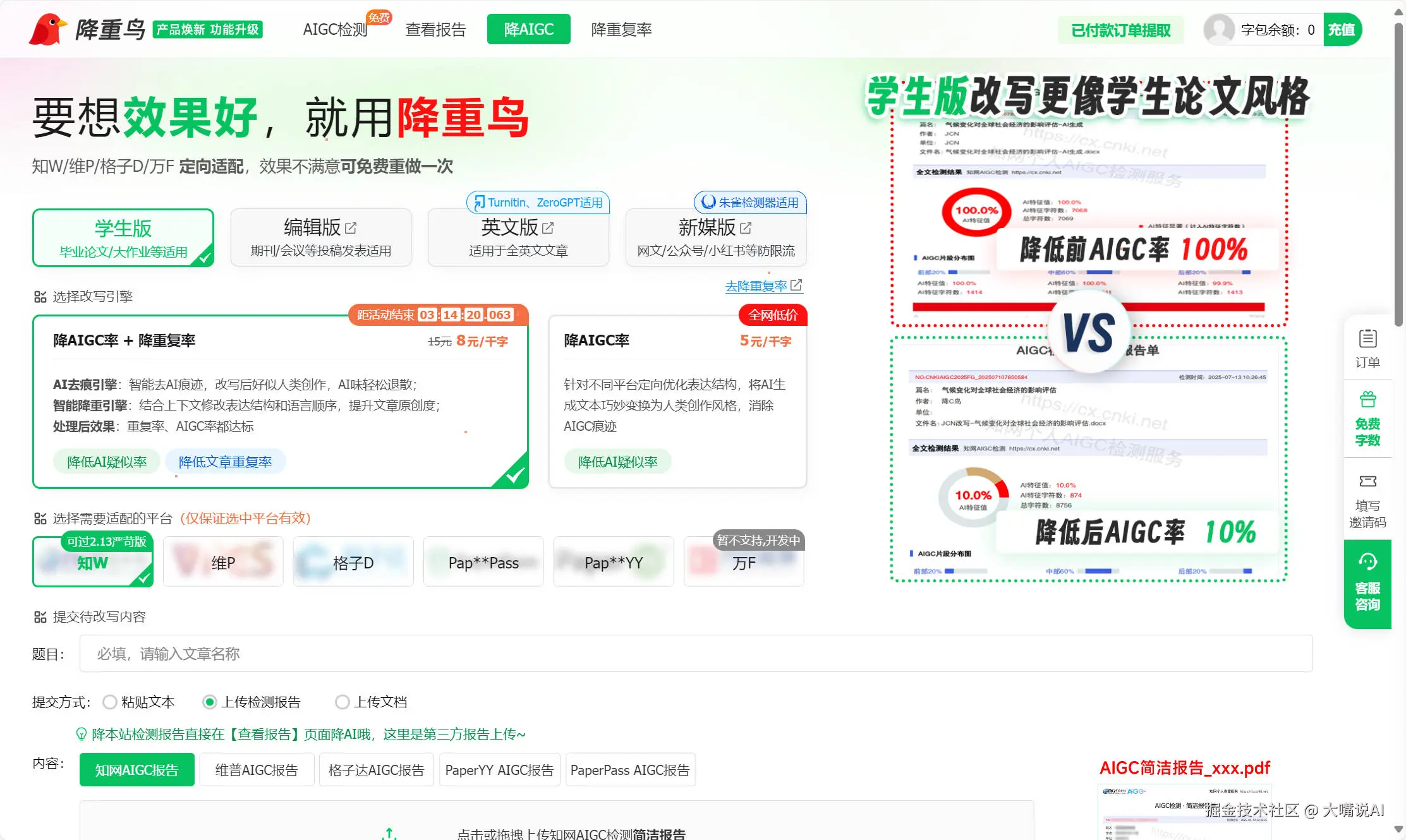 先来说说降重鸟,这可是目前在降AIGC领域效果最好、使用人数应该也是最多的工具了。它的功能相当强大,不管是中文还是英文的降AIGC和降重,它都能轻松应对。而且对于选择不同的平台进行降AI操作,降重鸟表现得十分出色,像常见的知网、维普、格子达、Tuinitin等平台,它都能完美支持,就连PaperPass、PaperYY这类第三方平台,也在它的支持范围之内。不仅如此,降重鸟还支持自定义降AI语言风格,有学生版、编辑版、英文版、新媒版可供选择。这意味着什么呢?意味着无论你是学生,想要符合学术要求的表述;还是编辑,追求更加专业严谨的风格;亦或是从事英文相关工作,又或者是新媒体行业,需要活泼新颖的表达,它都能满足你。