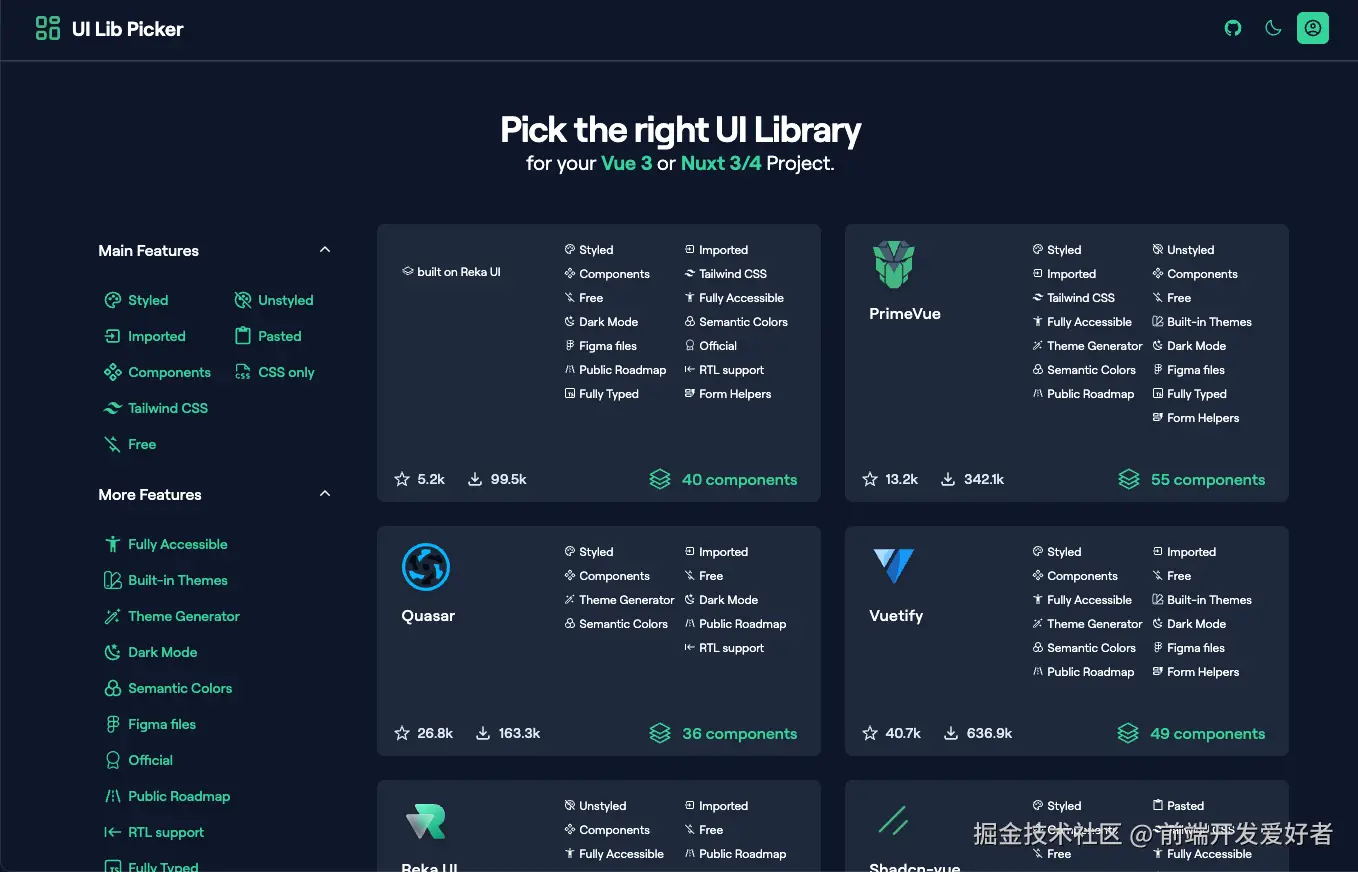 在 Vue3 官网 的「Ecosystem → UI Components」菜单里,官方维护了一份精挑细选的组件库清单:全部基于 Vue3、TypeScript 优先、活跃维护、社区认可。