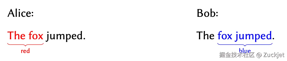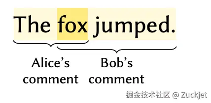 示例 4. 设想为某些文本分配彩色高亮显示。Alice 为 “The fox,” 应用红色高亮,而 Bob 为 “fox jumped” 应用蓝色高亮: