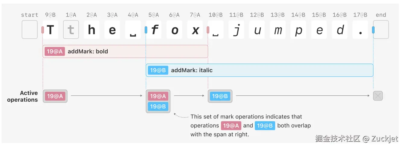 由于每个操作仅影响其 markType(粗体、斜体等)指示的方面,我们可以分别考虑每种 markType的操作。在上一节的示例中,我们很容易看出单词 “fox” 应该同时是粗体和斜体,因为粗体和斜体操作与该单词重叠。