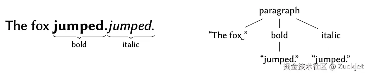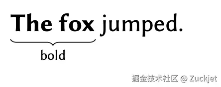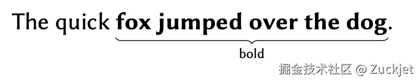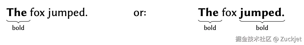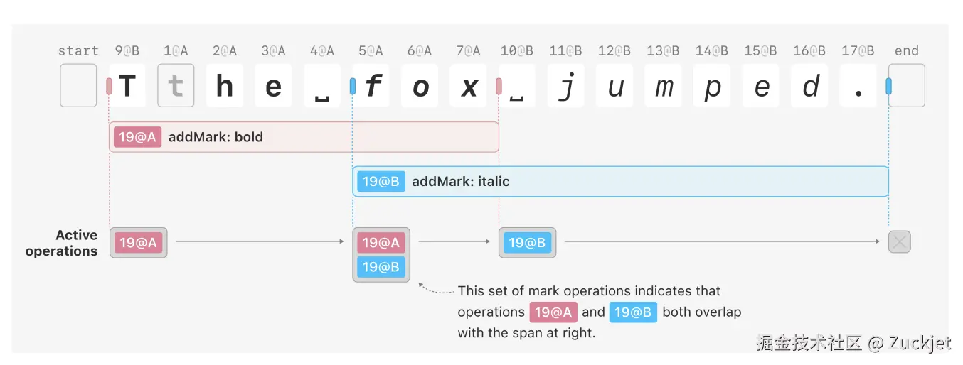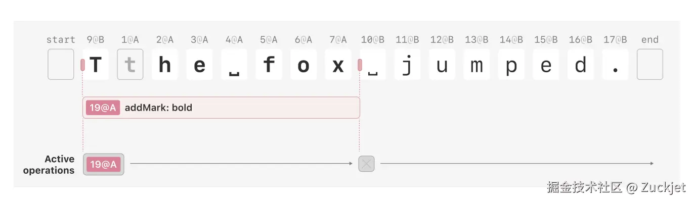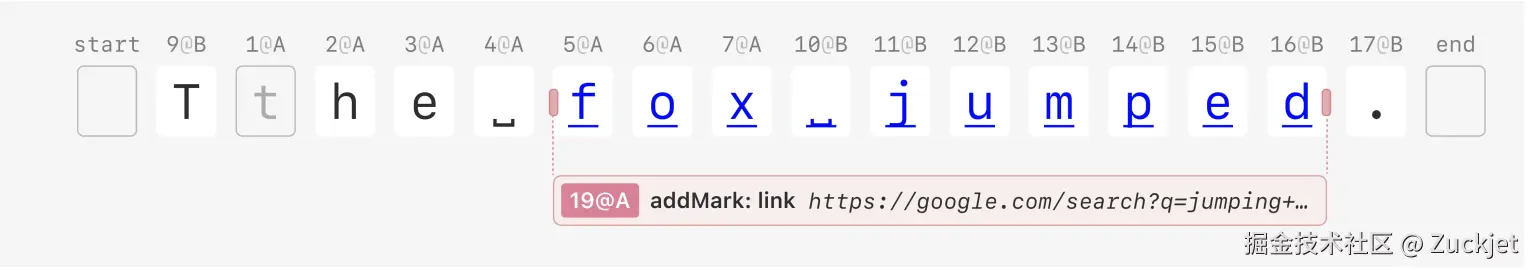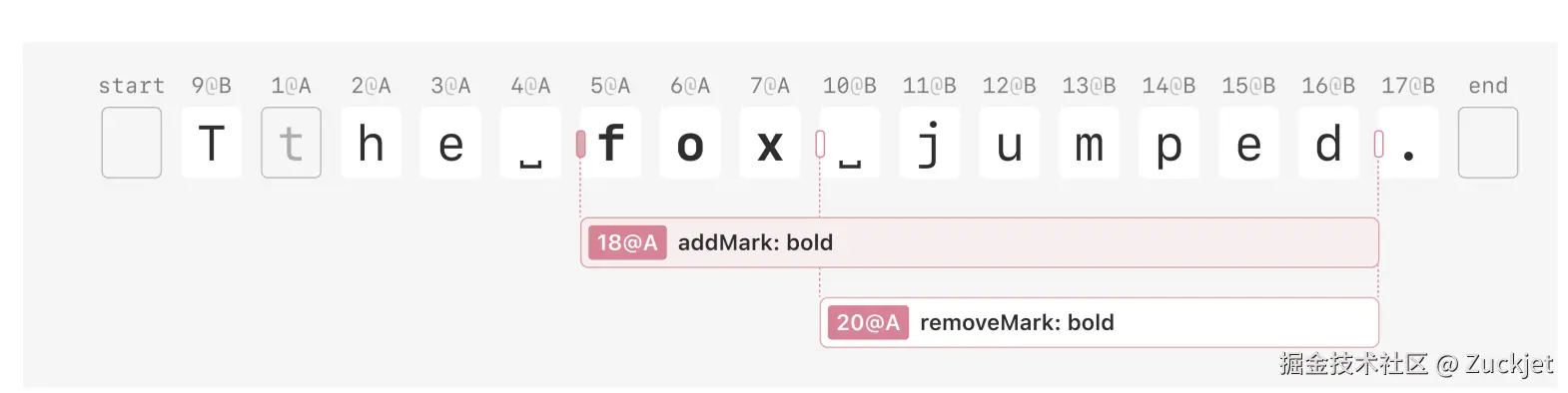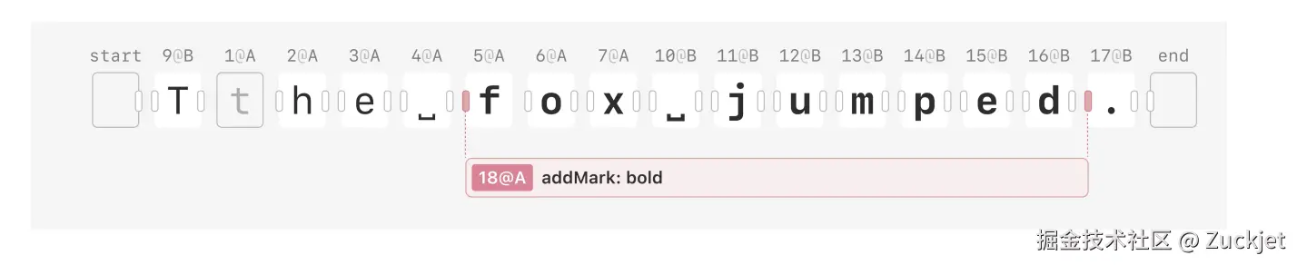 格式更改总是发生在两个字符之间的间隙。示例 addMark操作中的 type: "before" 属性表明:加粗区间起始于“f” 之前的间隙(即 “f” 是粗体,但其前面的空格不是)。加粗区间结束于“.” 之前的间隙(即 “jumped” 的 “d” 是粗体,但句号不是)。如果我们希望一个区间起始于或结束于某个特定字符之后的间隙,我们也可以选择 type: "after"。此外:如果我们希望区间始终起始于文档开头,start 属性可以是"startOfText"。如果我们希望区间结束于最后一个字符之后,end属性可以是 "endOfText"。