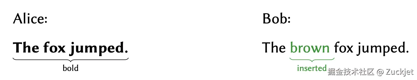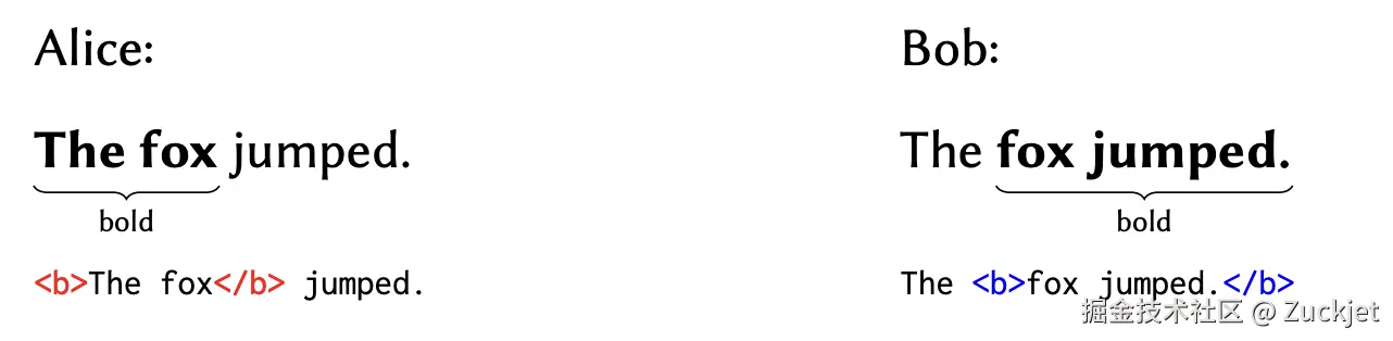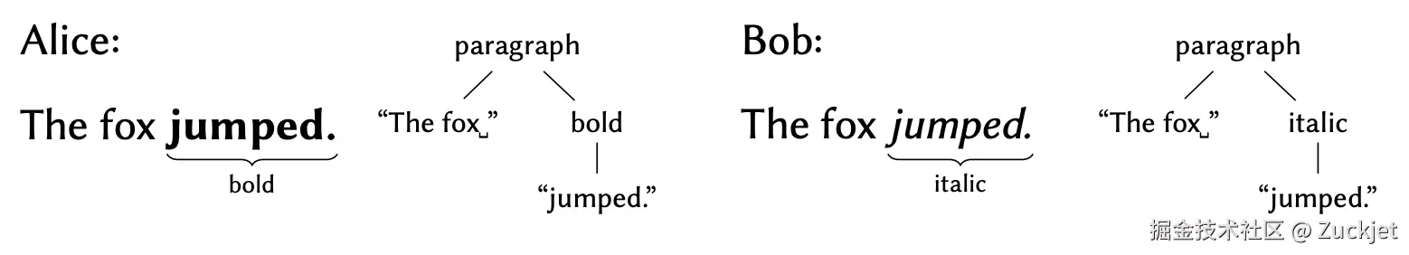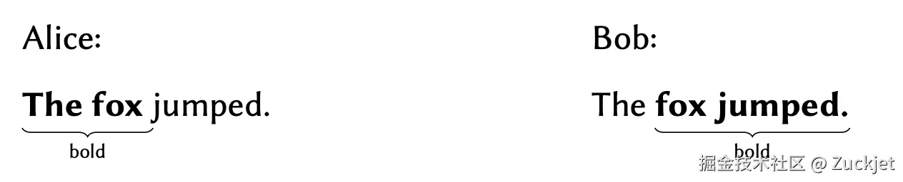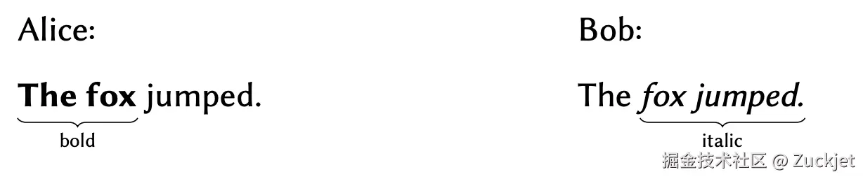 Alice 将单词 “jumped” 应用粗体格式,得到 “The fox jumped.”。与此同时,Bob 将斜体格式应用到同一个单词上。