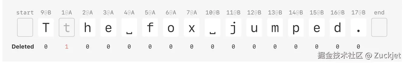 在图 2 中,Alice(节点 ID A)首先输入文本 “the fox”,生成 opId 1@A到 7@A。然后 Bob(节点 ID B)删除了开头的小写 “t”(initial lowercase “t”)(删除操作的 opId 是 8@B)并用大写 “T”(uppercase “T”) 替换它(opId 9@B),最后 Bob 输入了剩余的文本 “␣jumped.”(opId 10@B到 17@B)。因此,最终文本是 “The fox jumped.”,但小写 “t” 仍然在序列中,只是被标记为已删除。