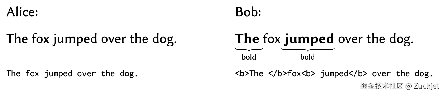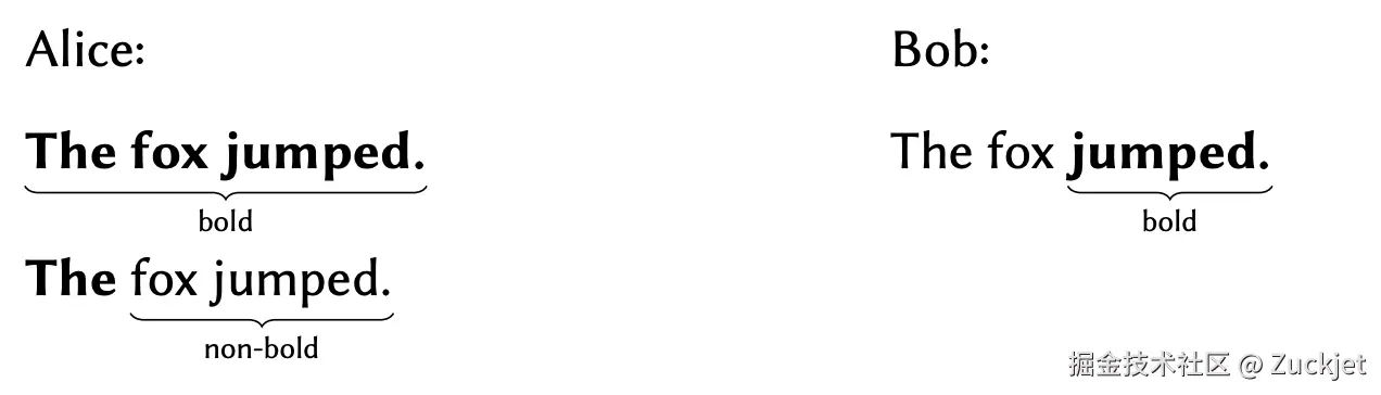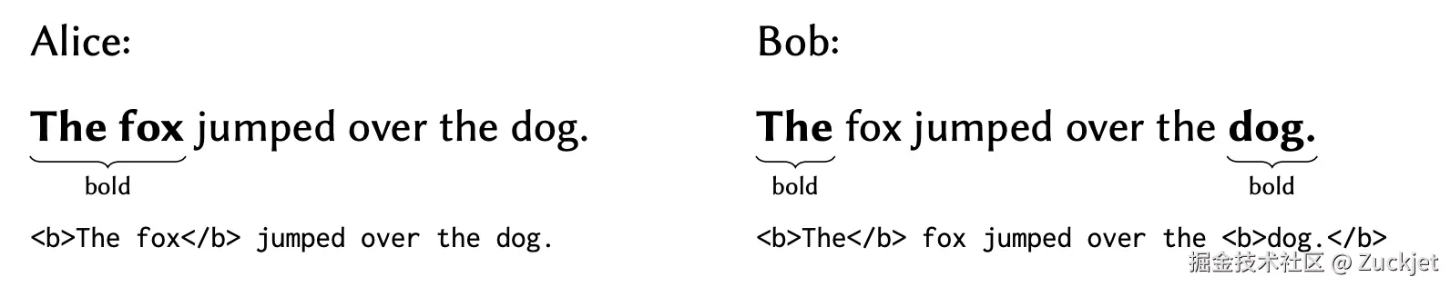 Alice 取消加粗单词 “jumped”,而同时 Bob 取消加粗短语 “fox jumped” 并加粗单词 “dog”: