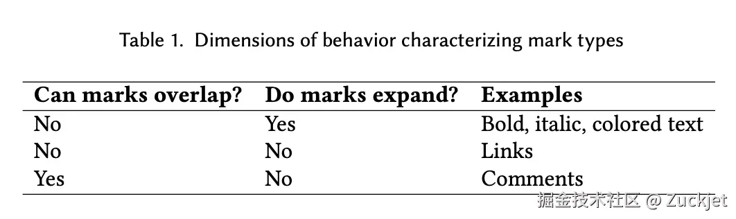 对于不应在结尾扩展的标记(如链接和评论,参见表 1),addMark 使用 type: "before" 作为 start,type: "after"作为 end。对于 removeMark,角色是相反的:这些操作使用 type: "after" 作为 start,type: "before"作为 end。这确保了当文本插入到链接的结尾时,该文本不属于链接的一部分,无论链接结束是因为创建它的 addMark 结束,还是因为一个 removeMark 的开始移除了后续字符的链接属性。
