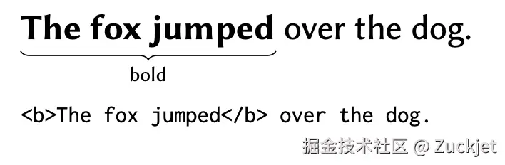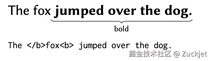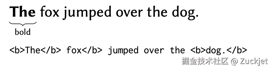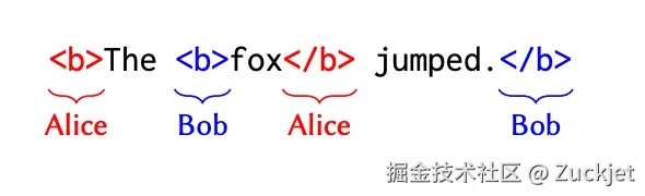 如果我们修改算法,复制初始的起始粗体标记,使其变为 <b><b>The</b> fox</b> jumped over the <b>dog.</b>,那么单词 “dog” 将会是粗体,但现在取消单词 “fox” 的加粗效果就会失效。无论我们尝试对这个算法应用多少层修复,我们都没有找到一个能够准确保留用户意图的变体。