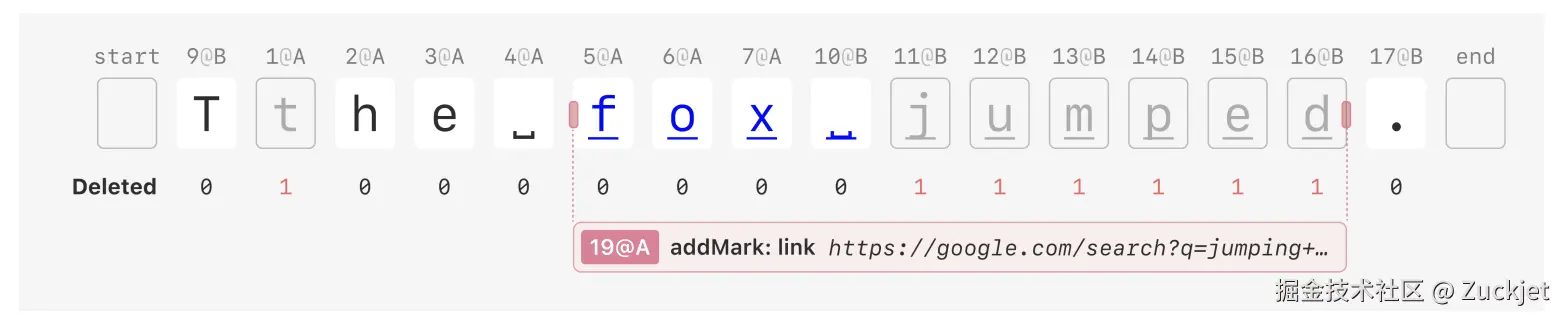 还需要一个细节来确保在链接结尾插入的行为正确:链接结束点所锚定的字符可能被删除(成为墓碑)。在图 6 的示例中,“fox jumped” 被链接,然后单词 “jumped” 被删除。