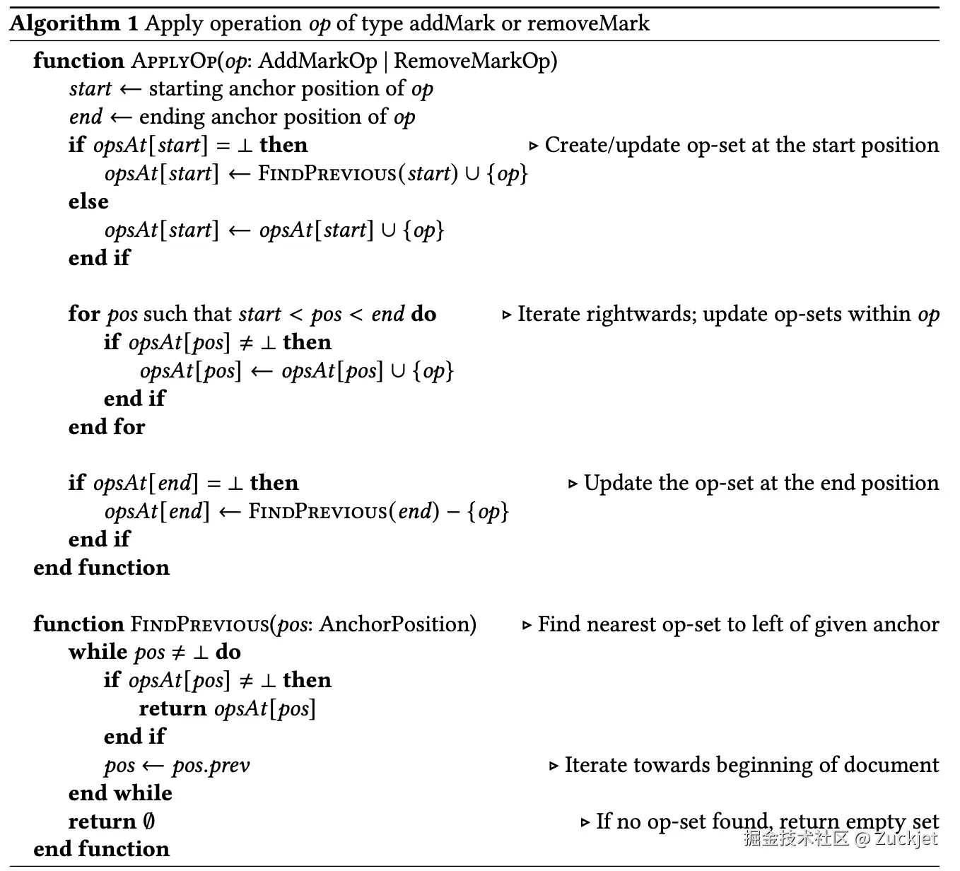 𝑆 恰好包含与该锚点位置重叠的所有 addMark 和 removeMark 操作的集合。换句话说,𝑆 中的每个操作起始于 𝑝 或之前,并结束于 𝑝 之后。 同一个 op-set 𝑆 也适用于 𝑝 之后的所有连续位置(其中 op-set 不存在);op-set 仅存在于格式可能更改的位置。这是一种压缩:我们可以在许多锚点上冗余存储相同的 op-set,但仅将 op-set 存储在格式区间的边界处可以节省内存。 算法1展示了将 addMark 或 removeMark 操作应用于 CRDT 状态的伪代码。总结:让 𝑜𝑝𝑠𝐴𝑡 是一个可变的列表,包含按锚点位置索引的 op-set。我们用 opsAt[𝑝] = ⊥表示锚点位置 𝑝 的 op-set 不存在。我们首先更新新操作起始位置的 op-set。然后更新操作区间内的任何现有 op-set。最后,我们在操作的结束位置添加一个不包含该操作的 op-set,以标记在该序列点活动操作已更改。