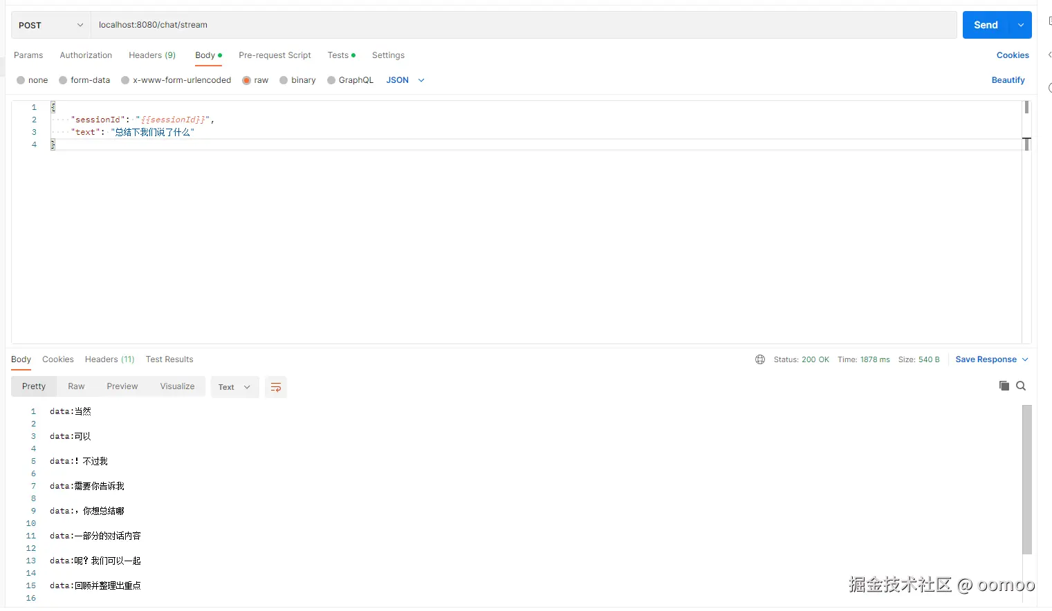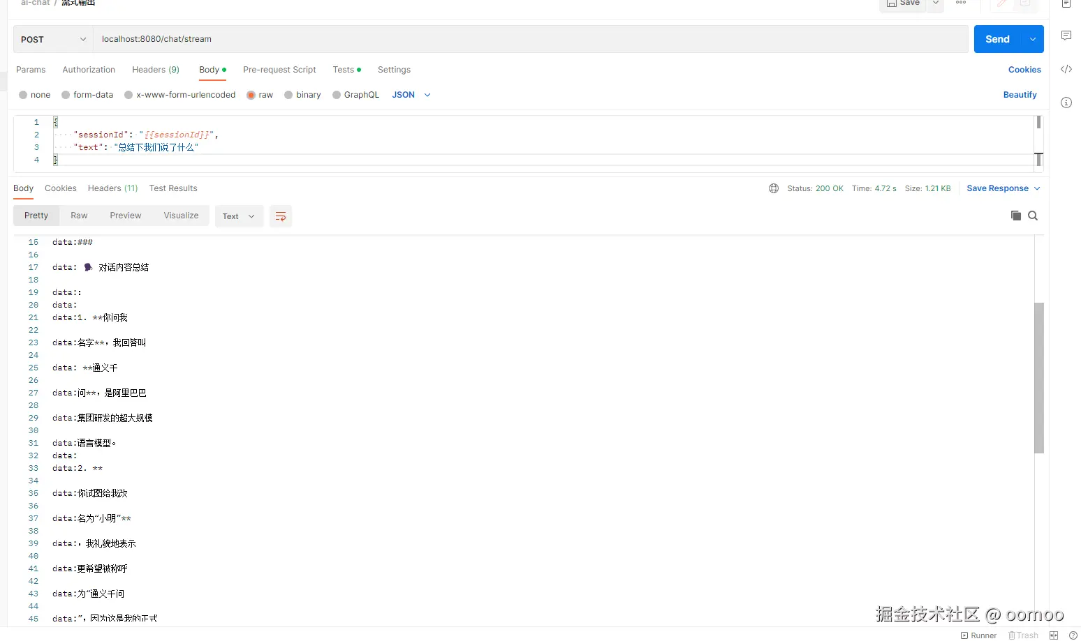 我们调用接口,随便发起回话,最后我们发送提问,让AI总结我们的对话,我们看下效果