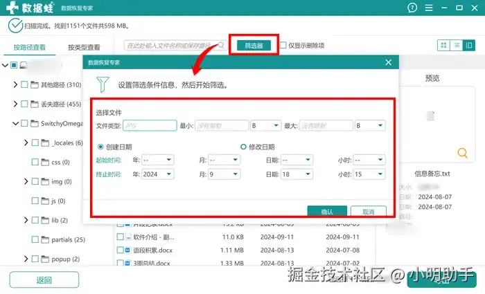 在上方点击【筛选器】,根据目标文件的信息输入大致范围,点击【确认】。