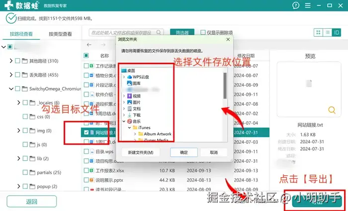 步骤3: 点击【导出】后,在小弹窗中选择恢复文件的存放位置。