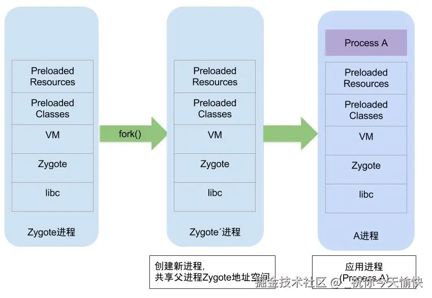 zygote进程内加载了preload()方法中的所有资源,当需要fork新进程时,采用copy on write技术,如下:
