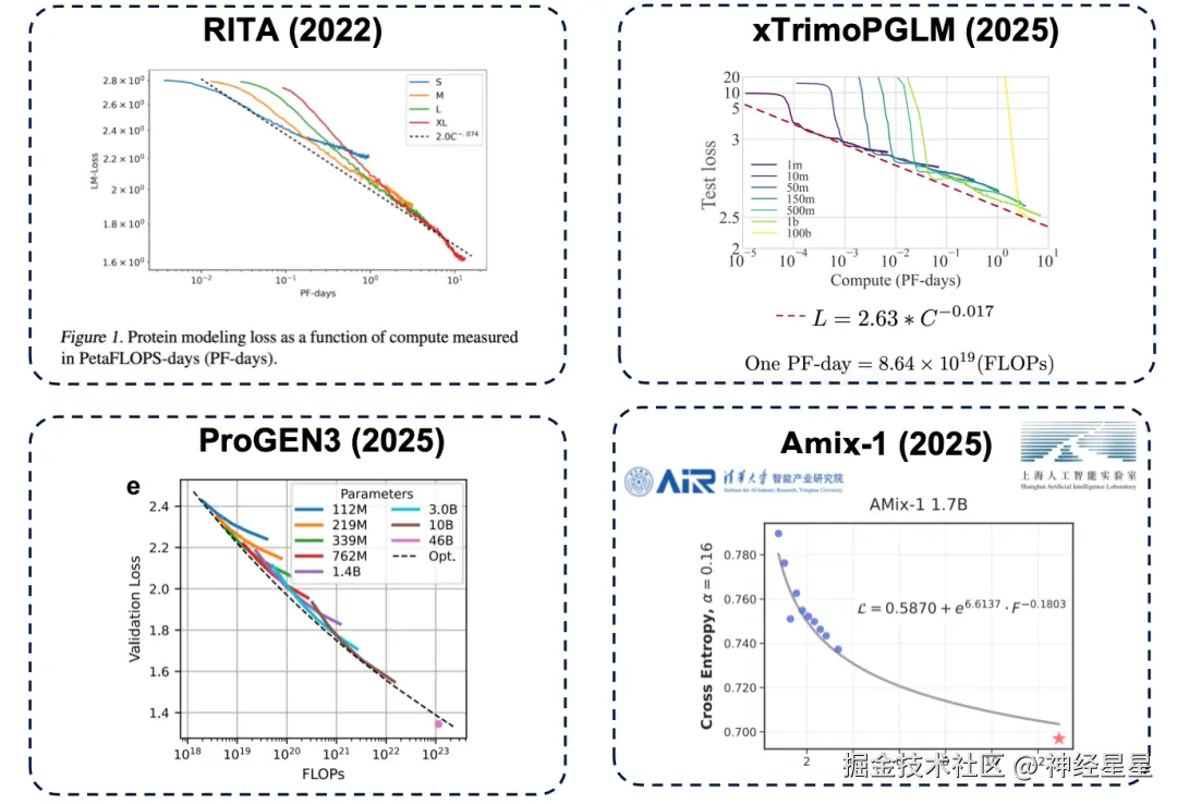 其中,参数规模是决定模型性能上限的关键因素。如果参数量不足,即使投入更多计算资源(通俗地讲就是「花更多钱」),模型的性能也会遇到瓶颈。在蛋白质语言模型领域,同样存在这样的规律,并且已经被多篇研究证实,代表性工作如:代表性工作如:RITA 、 xTrimoPGLM 、 ProGEN3 、 Amix-1 。