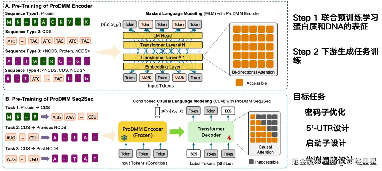 第一个阶段,联合预训练学习蛋白质和 DNA 的表征。输入包括蛋白质序列和 DNA 序列, 通过 Transformer 架构进行语言模型的训练。目标是同时学习蛋白质序列、密码子序列以及 DNA 序列的表征。第二阶段,在下游任务上训练生成任务,例如:从蛋白质到编码序列(CDS),给定一个蛋白质就能够生成出来一列 DNA 序列。