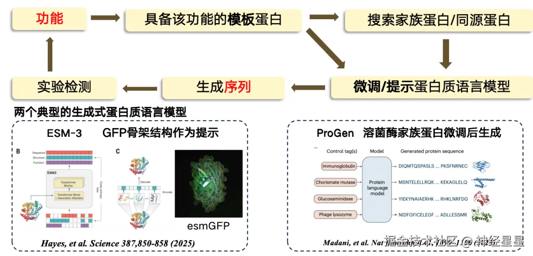 在当前的研究中,从功能到序列的设计大多采用模板化思路,如果已知某个模板蛋白具备特定功能,就可以以它为基础去寻找或者生成一个新的区域。 其流程是先从功能到模板序列,从模板蛋白可能会搜索出来一些家族蛋白/同源蛋白,再对蛋白质语言模型进行微调,利用微调后的语言模型生成新的序列区域,最终进行实验检测。