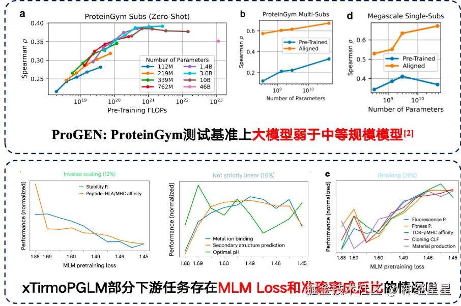有研究表明,如果训练数据本身存在大量噪声时,单纯增加模型参数量并不能改善结果,因此大家应该更关注数据的质量。在 ProteinGym 基准上的蛋白质突变预测任务中发现,中等规模的模型在准确率上表现反而较好。另外开发 xTirmoPGLM 的团队也发现了存在一些非正相关的案例,即预训练的性能跟下游任务的性能不相匹配。