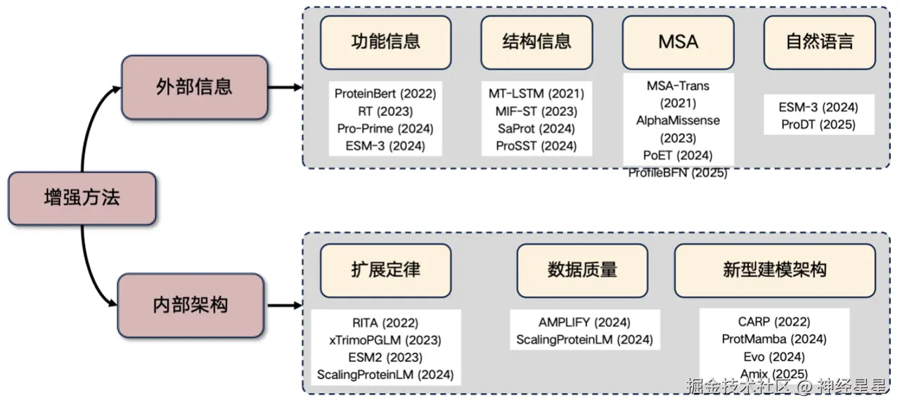 最后,补充一个当下非常热门的研究方向——蛋白质语言模型的增强。如果你打算在这个领域开展研究,可以从以下思路切入——引入外部信息、改进内部架构。
