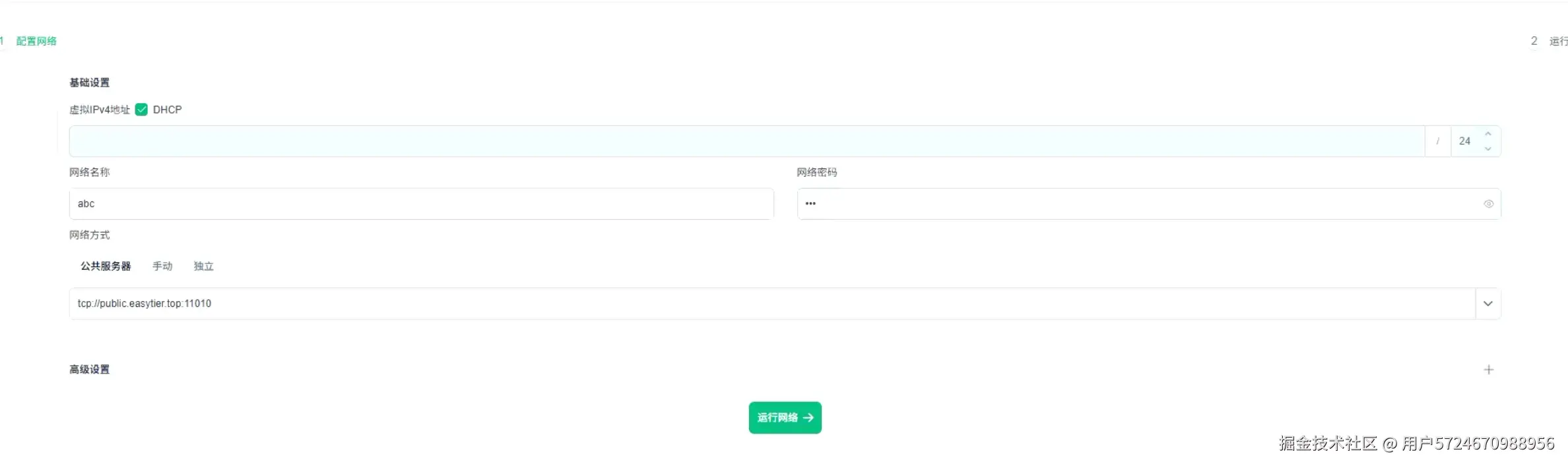 服务器地址:默认 tcp://public.easytier.cn:11010(公共服务器)